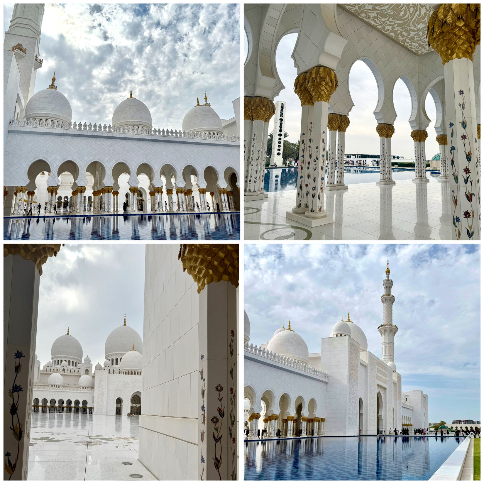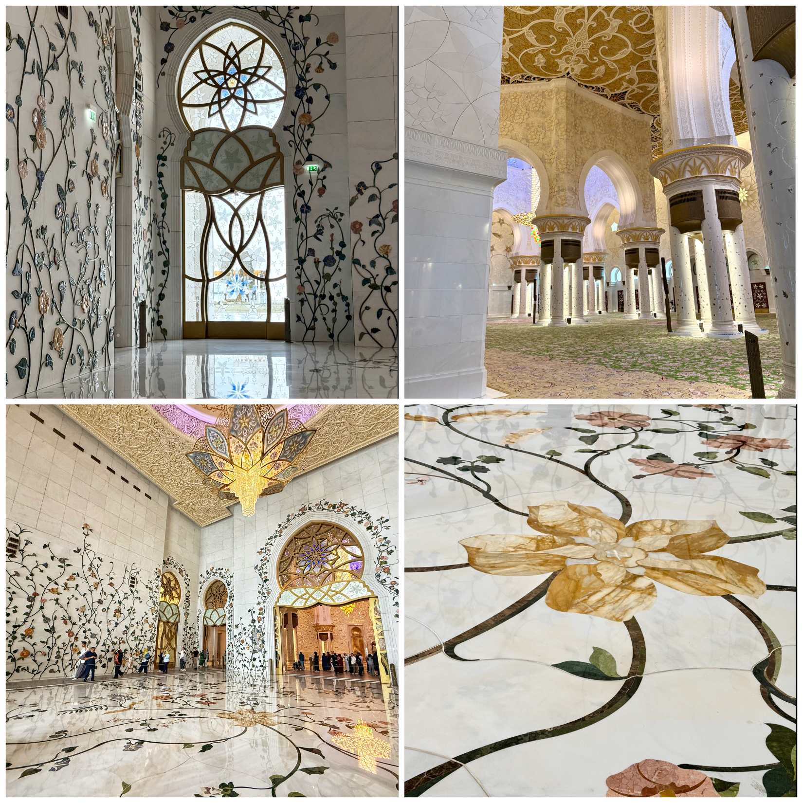 Dekoracje wnętrz wykonywali artyści z całego świata. W meczecie znajduje się siedem pozłacanych żyrandoli o różnych rozmiarach, wykonanych z kryształów Swarovskiego największy z nich jest jednocześnie największym na świecie żyrandolem. Moim zdaniem najpięknieszy meczet w jakim do tej pory byłam.
